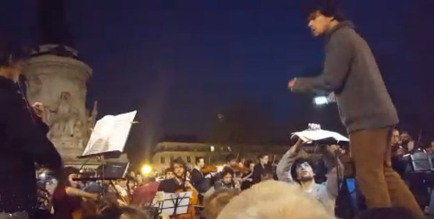 Though the protest movement Nuit Debout (Up All Night) in the Place de la République in Paris turned sometimes in violent actions, the atmosphere was festive yesterday evening when a symphony orchestra of 300 musicians played the New World Symphony by Antonin Dvorak « to give courage to all those who invent for three weeks tomorrow’s world », according to organizers. The work, according to them, had a significant symbolic meaning for the entire movement. The Nuit Debout movement describes itself as a gathering of ordinary citizens who want to create a fairer world.