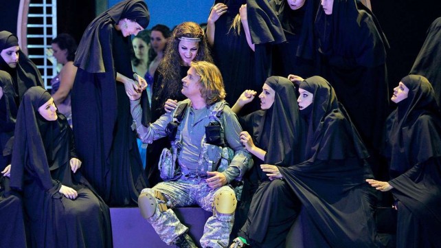 Sehr schön dann auch Laufenbergs Botschaft zum Schluss, wo alle Reliquien wie Kreuz, Gebetsteppich oder Menora abgelegt werden und Christen, Juden und Moslems gemeinsam und ‘erleuchtet’ die jetzt aufgebrochene und nach außen hin offene Kirche verlassen. Das ist nur eines der vielen starken Bilder, die Laufenberg in seiner Inszenierung verwendet und auf die wir leider hier nicht alle eingehen können. Die Personenregie ist vor allem in dem 1. Und dem 3. Akt sehr gut gelungen und durchgehend konsequent, während im 2. Akt, der in einem Hamam spielt, wirklich noch Luft nach oben ist. Insbesondere der langen Konfrontation zwischen Parsifal und Kundry fehlt es an Intensität und Glaubwürdigkeit. Trotzdem muss man sagen, dass Uwe Eric Laufenberg mit seiner Inszenierung schon im ersten Bayreuther Jahr ein großer Wurf gelungen ist. Dieser szenisch sehr ausdrucksstarke und tiefgreifende Parsifal findet auf musikalischer Ebene (Vorstellung vom 24. August) ein quasi oratorienähnliches Gegengewicht. Hartmut Haenchen dirigiert zügig und sehr transparent. Was einem seiner Vorgängervor einigen Jahren nicht gelungen ist, nämlich Ansätze der historischen Aufführungspraxis mit in das Interpretationskonzept einzubauen, wird heuer vom Publikum bejubelt. In den Hauptrollen überzeugen insbesondere Georg Zeppenfeld als Amfortas (eine Jahrhundertstimme), Klaus Florian Vogt als Parsifal und Elena Pankratowa als Kundry. Sehr gut auch Ryan McKinny als Amfortas und Karl-Heinz Lehner als Titurel, während Gerd Grochowski als Klingsor eher blass bleibt.
