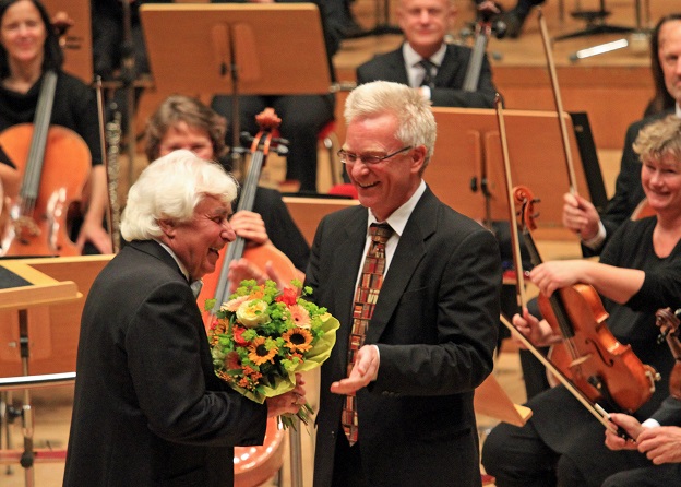 Orchestervorstand Georg Heimbach bedankt sich bei Dmitrij Kitajenko für die 30-jährige künstlerische Zusammernarbeit